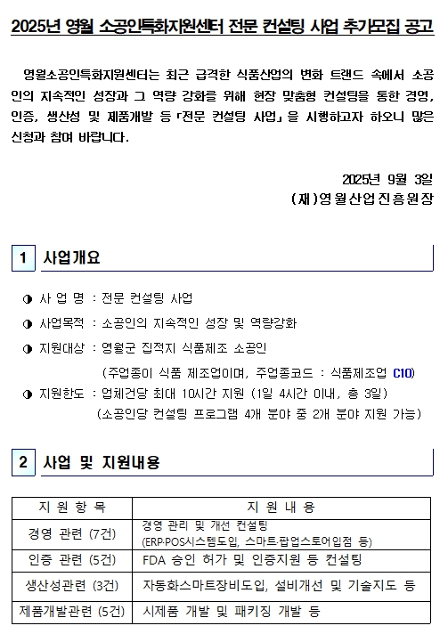 제 목 : 2025년 영월 소공인특화지원센터 전문 컨설팅 사업 모집(추가) 공고