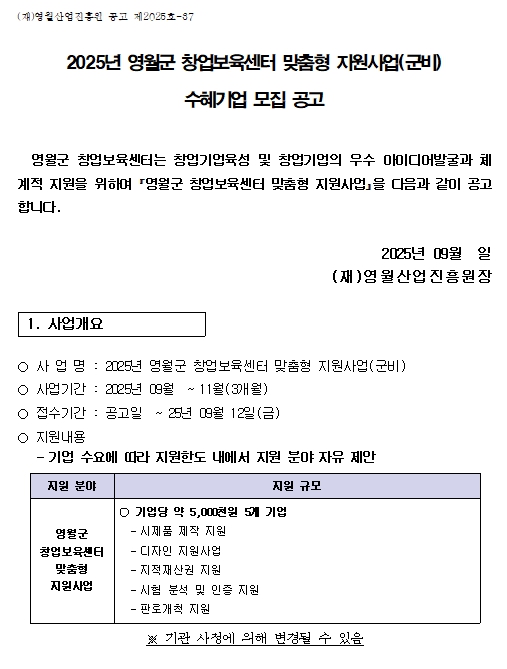 제 목 : 2025년 영월군 창업보육센터 맞춤형 지원사업(군비) 수혜기업 모집 공고