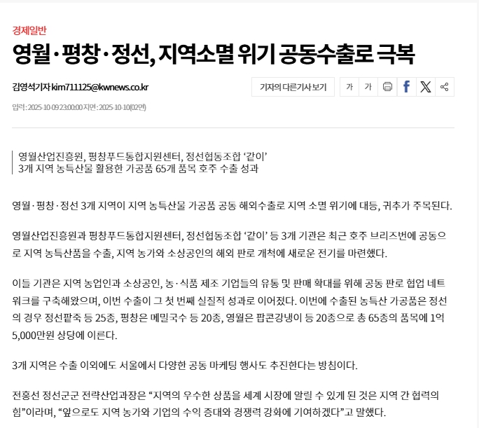 제 목 : [강원일보] 영월,평창,정선 지역소멸 위기 공동수출로 극복