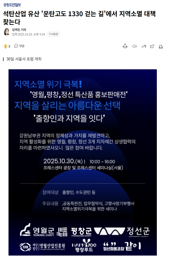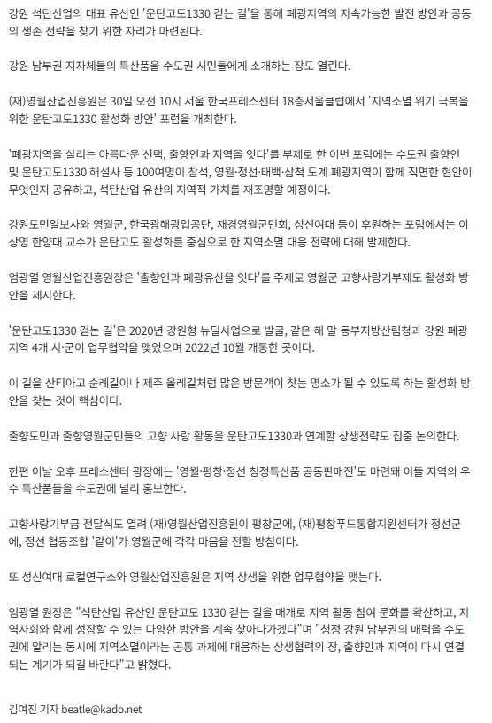 제 목 : [강원도민일보] 석탄산업 유산 '운탄고도 1330 걷는 길'에서 지역소멸 대책 찾는다