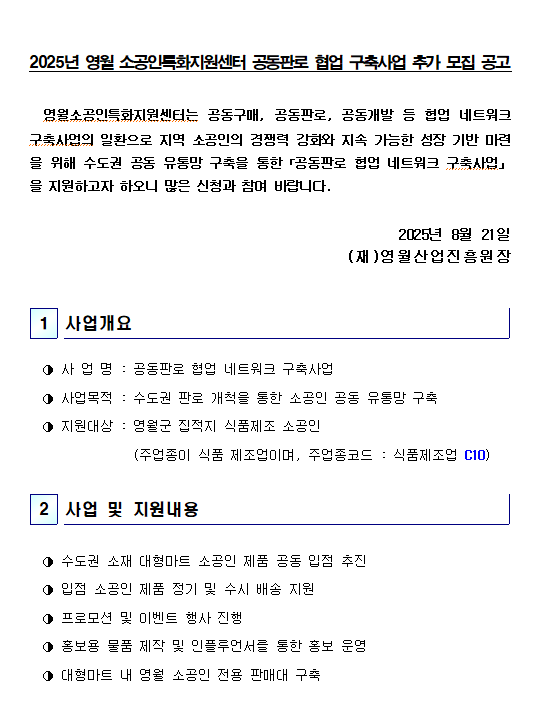 제 목 : 2025년 영월 소공인특화지원센터 공동판로 협업 구축사업 추가 모집 공고