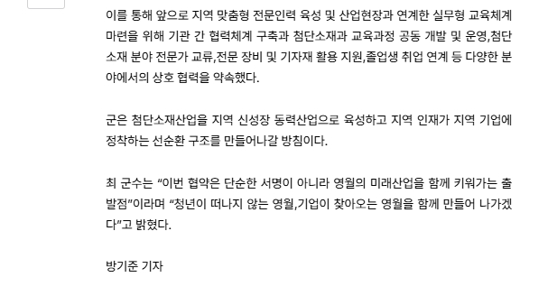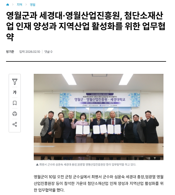 제 목 : [강원도민일보] 영월군과 세경대,영월산업진흥원, 첨단소재산업 인재 양성과 지역산업 활성화를 위한 업무협약